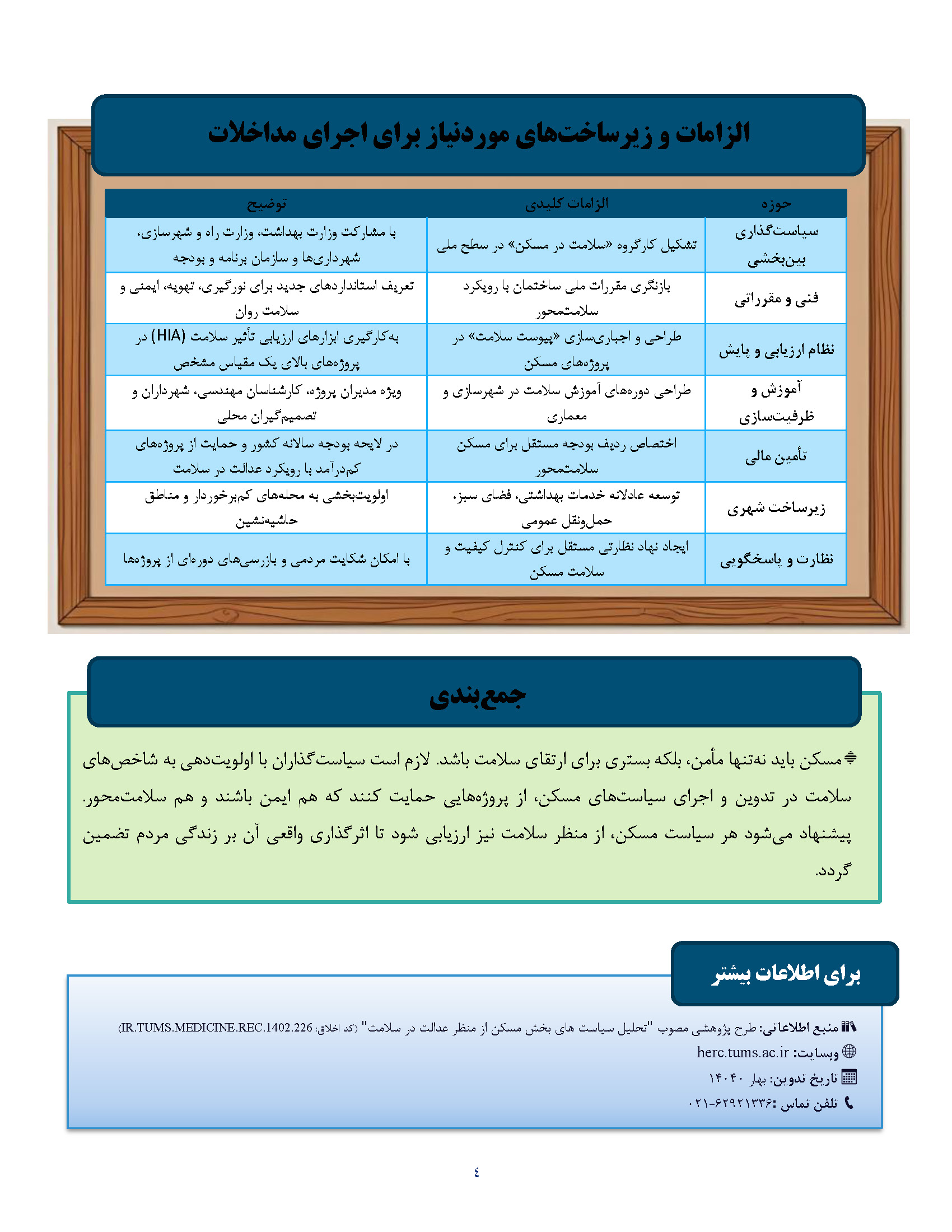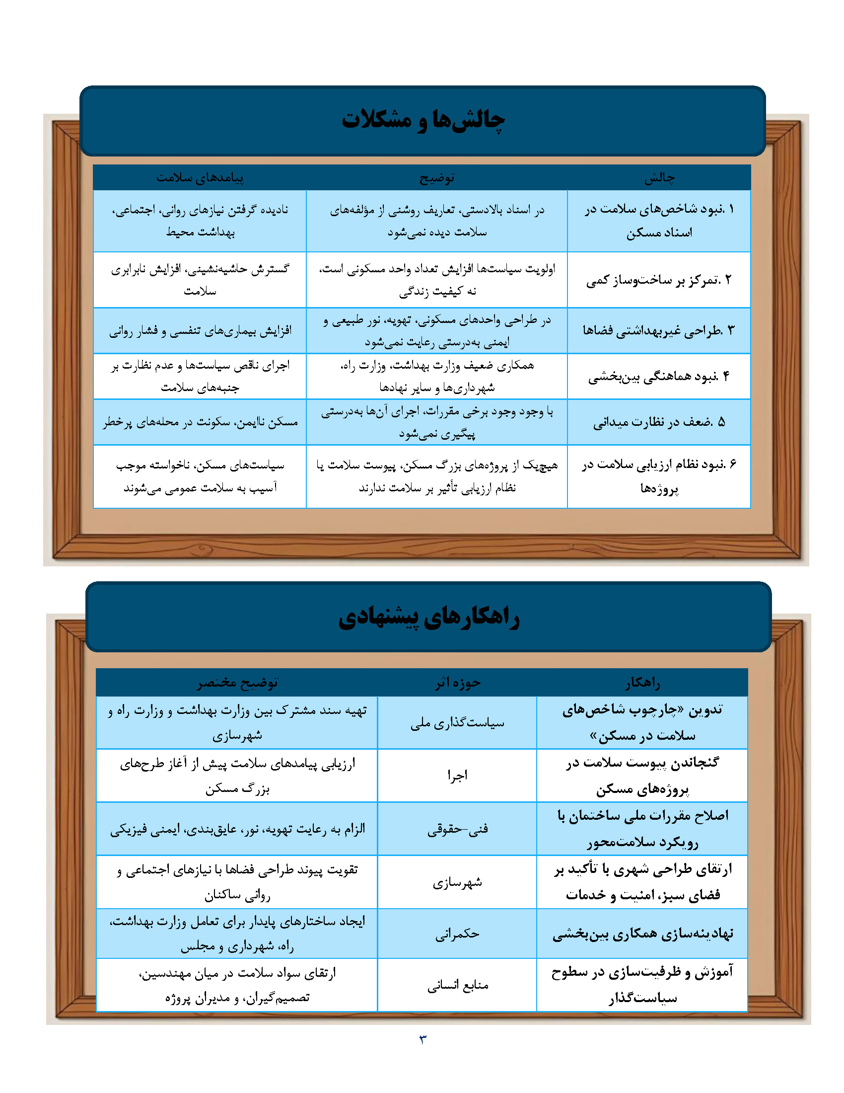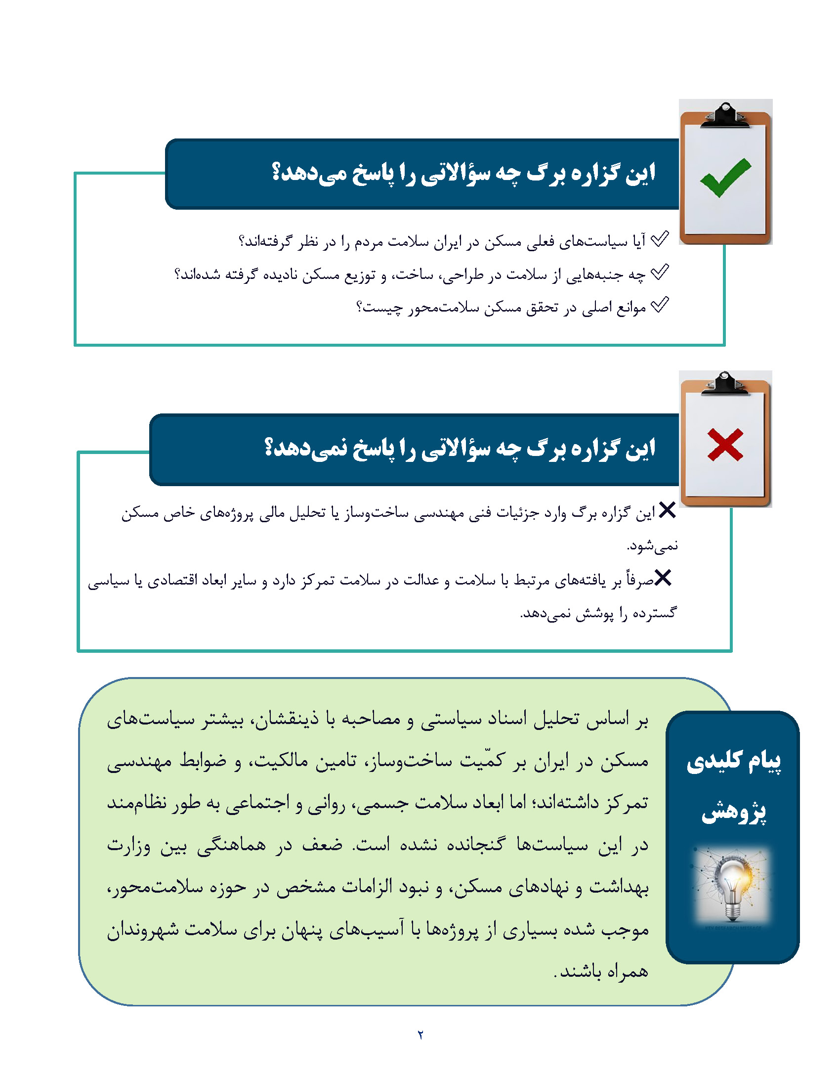 بر اساس تحلیل اسناد سیاستی و مصاحبه با ذینقشان، بیشتر سیاست های مسکن در ایران بر کمّیت ساخت و ساز، تامین مالکیت و ضوابط مهندسی تمرکز داشته اند؛ اما ابعاد سلامت جسمی، روانی و اجتماعی به طور نظام مند در این سیاست ها گنجانده نشده است. ضعف در هماهنگی بین وزارت بهداشت و نهادهای مسکن، و نبود الزامات مشخص در حوزه سلامت محور، موجب شده بسیاری از پروژه ها با آسیب های پنهان برای سلامت شهروندان همراه باشند.